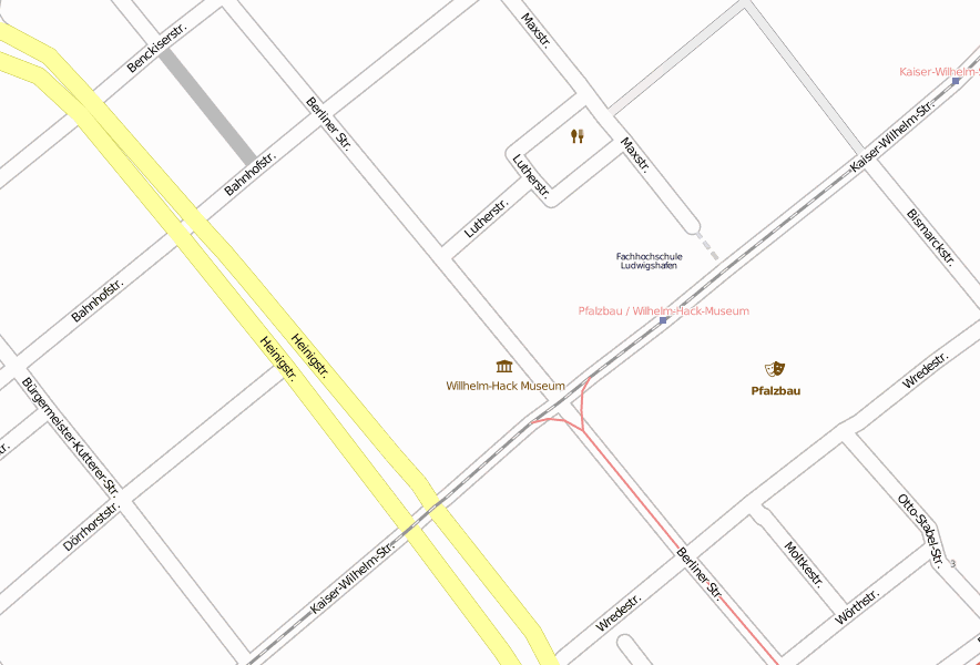 In der Umgebung finden Sie bekannte Sehenswürdigkeiten wie Wilhelm-Hack-Museum Ludwigshafen, Pfalzbau oder Lutherkirche . Interessant sind diese Landkarten: Stadtmuseum Ludwigshafen, Apostelkirche , St. Ludwig und Friedrich-Ebert-Halle